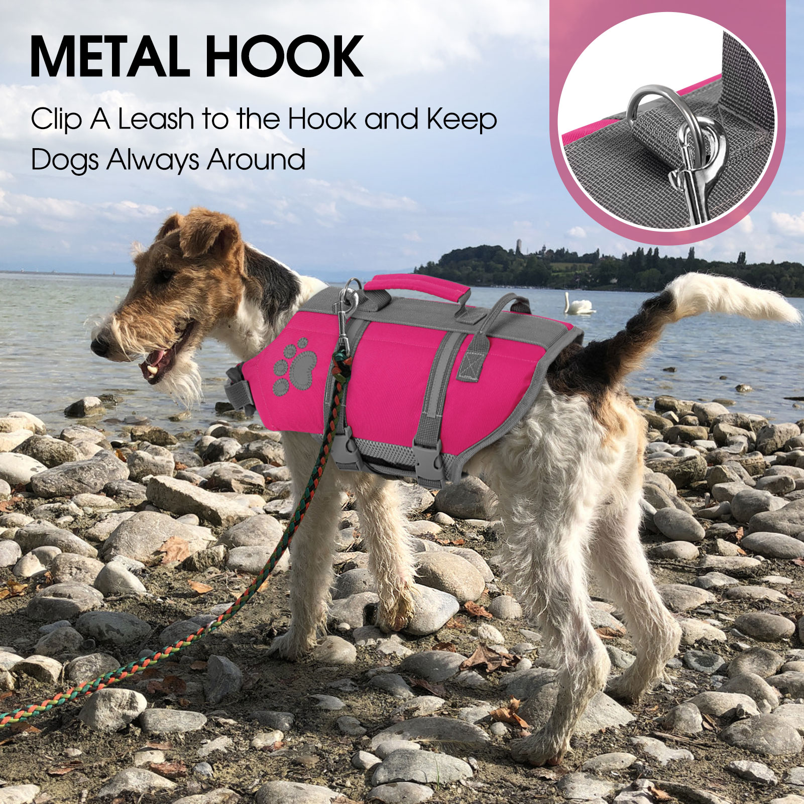 • Best Dog Life Vest for Swimming/ Boating/ Water Sports: The mental leash hook allows dog owners to attach their dog to a boat or dock while they are out on the water. This is especially useful during boating, kayaking, or paddleboarding. The leash hook also gives owners a way to regain control and prevent the dog from swimming too far or control active dogs when walking or hiking by water.